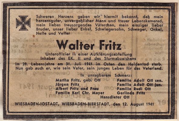 Im 28. Lebensjahr musste Walter Fritz als Unteroffizier einer Aufklärungseinheit in einer Fahrradschwadron sein junges Leben lassen. Zum Zeitpunkt seines Todes waren seine Eltern bereits ebenfalls tot: Der Vater war im 1. Weltkrieg gefallen.